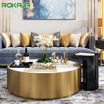 Table basse ronde simple moderne support en acier inoxydable brillant plaqué or meubles d'appartement d'hôtel table centrale en dalle de roche